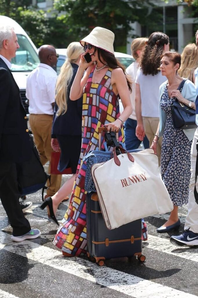 En la primera imagen revelada, Hathaway aparece recargada en una barda blanca, luciendo un conjunto de chaleco y pantalones de rayas, botas negras y un collar de perlas. Su sonrisa amplia y postura relajada evocan la esencia de Andy, pero con una madurez estilística que refleja el paso del tiempo. Este atuendo, sobrio y elegante, marca un contraste con los looks más atrevidos que definieron su transformación en la cinta original.