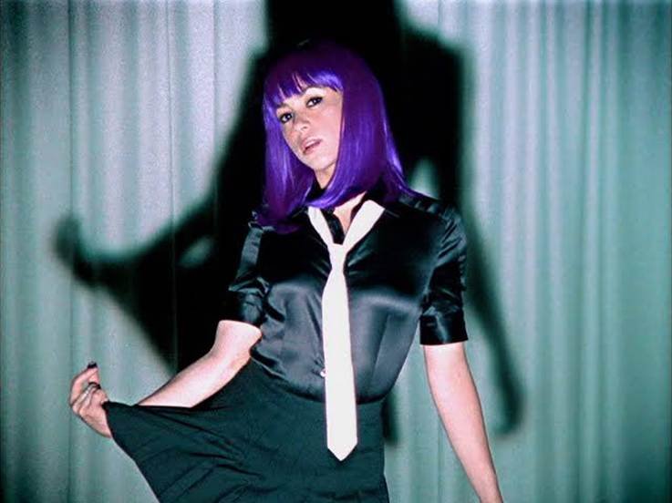 La pieza central: La icónica peluca morada corta (corte bob).