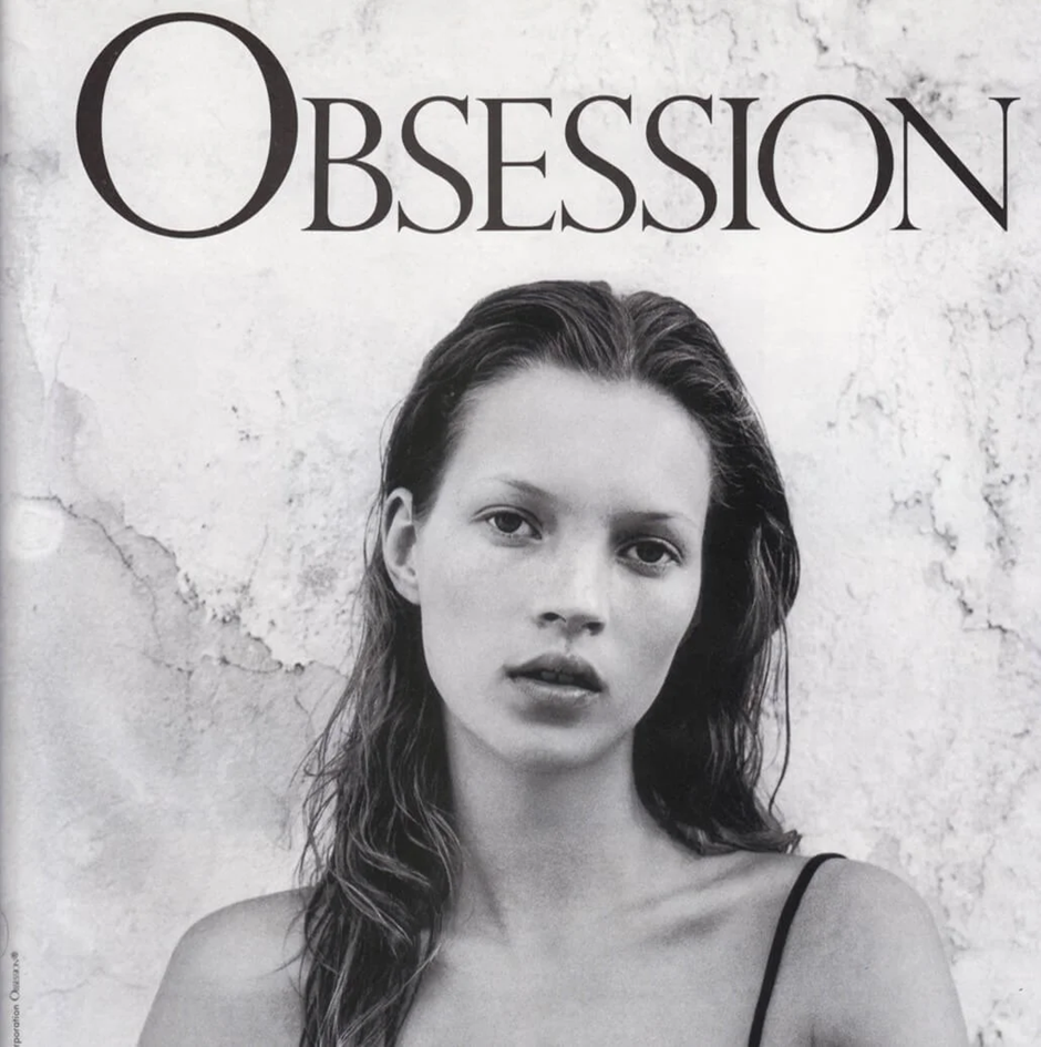 Si algo cementó a Obsession en la cultura popular fue la campaña publicitaria de 1993. Un joven fotógrafo, Mario Sorrenti, capturó a una entonces desconocida Kate Moss en las Islas Vírgenes. Las imágenes en blanco y negro, granuladas definieron la estética del “heroin chic” y el minimalismo de los 90.